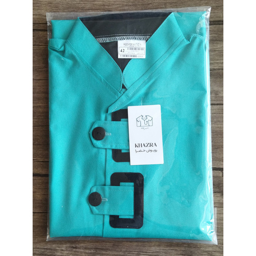 روپوش آشپزی مردانه خضرا کد 73812 (رنگ سبز فیروزه ای ) در شرکت تبیان طب دیبا رازی طراحی و تولید شده است . پارچه این محصول ترگال می باشد . از ویژگی های این محصول عدم ایجاد حساسیت و عدم تعریق و وزن کم میباشد.پارچه ترگال کمی ضخیم تر از پارچه تترون می باشد که باعث افزایش عمر روپوش در برابر روپوشهای تترون میگردد .برای انتخاب سایز مناسب ، یک روپوش قدیمی را از پشت اندازه گیری کنید و با جدول راهنمای سایز که در تصاویر روپوش قرار داده شده مقایسه کنید .دقت کنید حتما براساس جدول ، سایز خودتان را انتخاب کنید و سایز روپوش ، بامدل یا برند دیگر را معیار انتخاب سایز قرار ندهید . کالایی که دریافت می کنید دارای مارک های دوخته شده (خضرا KHAZRA) می باشد و بر روی هر روپوش کد محصول و جنس پارچه قید شده است .